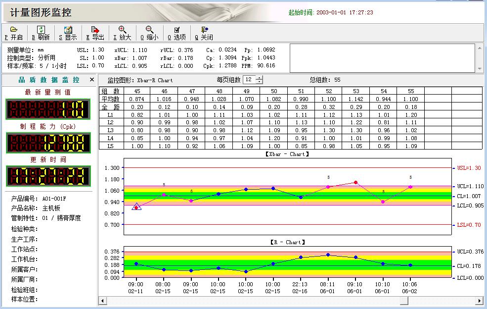 此窗口可以看到多個產(chǎn)品,多項(xiàng)特性最后一組數(shù)據(jù)的監(jiān)控狀態(tài):正常、警示、超規(guī)格界限、超管制界限;同時可對每一條記錄進(jìn)行圖形分析、查看歷史狀態(tài),對異常記錄進(jìn)行異常分析、異常圖形保存、8D-CAR等,有必要的話還可以自動發(fā)送郵件給指定人員;適合于上層領(lǐng)導(dǎo)人員對企業(yè)各部門的質(zhì)量狀況的全盤掌控。